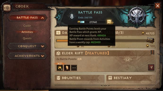 Pour niveler le pass de bataille, vous devez obtenir des points de bataille, qui peuvent être gagnés en complétant des fusils plus âgés, des primes, en atteignant des jalons et en complétant des donjons spécifiques. Ouvrez votre codex et sélectionnez l’onglet «Battle Pass» pour voir ce que vous pouvez encore faire pour gagner des points de bataille.