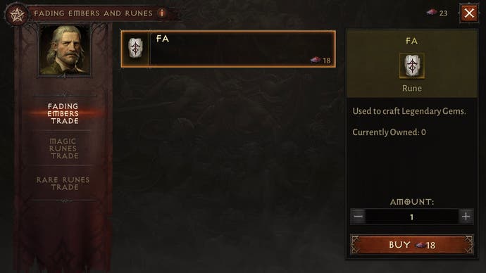 Lorsque vous avez gagné suffisamment de braises à la décoloration, allez dans les braises et les runes du vendeur situés juste en dessous des marches de Rift Elder Rift. Ici, vous pouvez échanger des braises de décoloration x18 pour X1 FA Rune, qui peut ensuite être utilisée pour élaborer un gemme légendaire de niveau 1 étoile, 2 étoiles ou 5 étoiles aléatoire.
