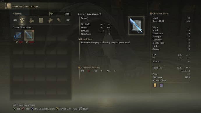 Une fois son dialogue terminé, vous pouvez ensuite acheter le sort Magic Glintblade pour 3000 runes, et le sort Carian Greatsword pour 10 000 runes.