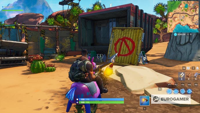 Il y a plusieurs camps de bandits dans cette zone de rift temporaire mais, si vous vous dirigez vers l’Est, vous avez un symbole de coffre-fort Fortnite et vous attendez. Si vous arrivez au camp dans son coin nord-est, vous devriez voir l’image à collectionner sur un conteneur jaune à l’entrée.