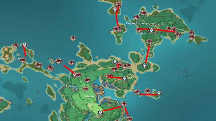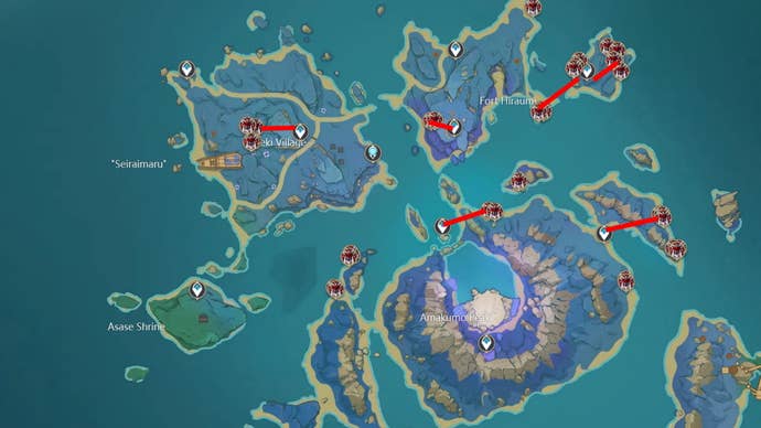La route agricole ici est un peu désordonnée. Le campement de Kujou n’a que le seul point de chemin, donc vous n’avez pas beaucoup de choix là-bas. Ensuite, voyez au Pyro Hypostase Waypoint pour le cluster nord, la statue des sept pour la plage nord et le Waypoint au nord de la forge pour les trois groupes près de là.